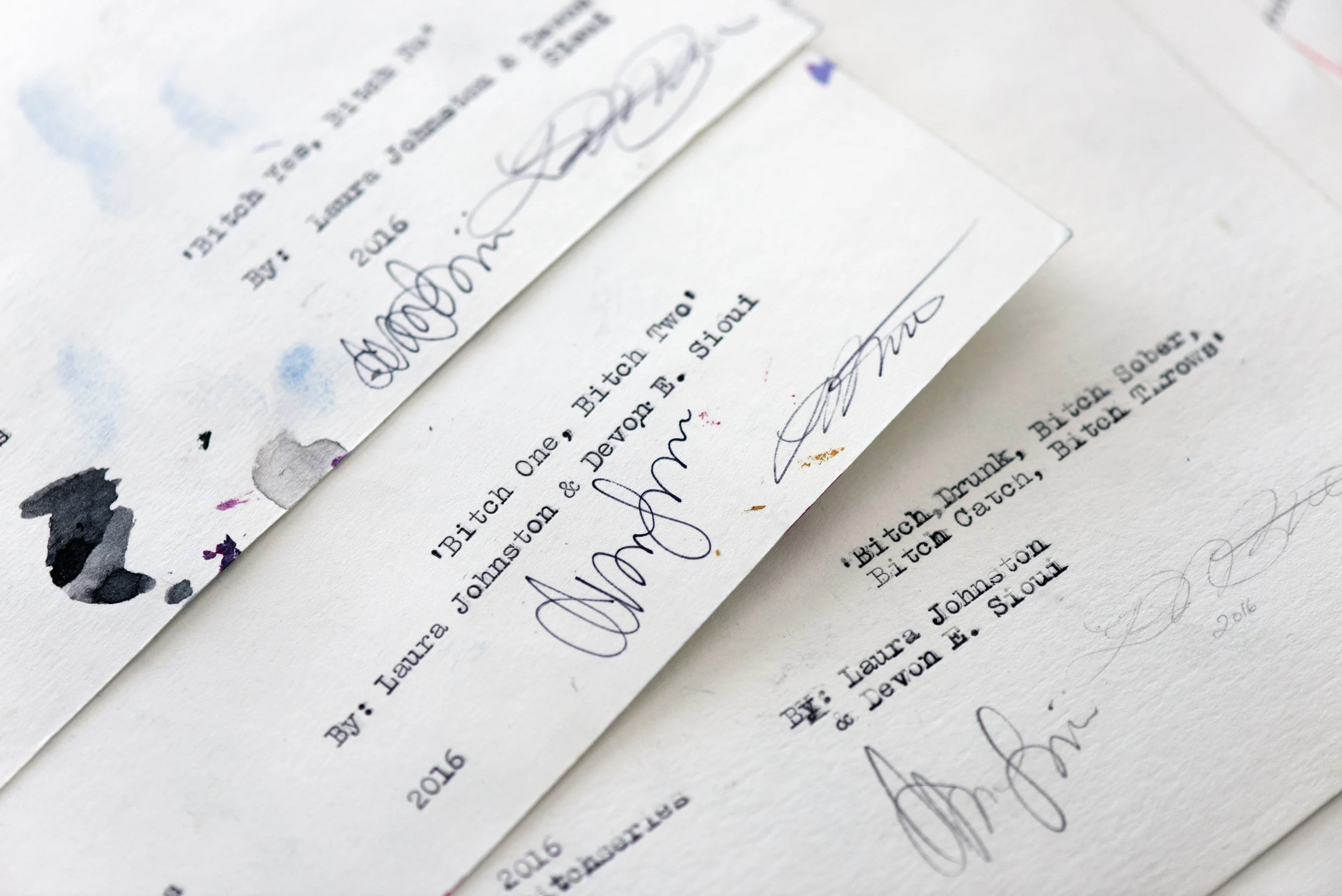 #BitchSeries is a ten-piece abstract portrait project completed in collaboration with California-based artist Laura Johnston. It began in October 2015 as ten skeleton paintings on paper, making the 2,600 -mile, cross-continent voyage several times until the pieces were deemed complete sometime in late April 2016. The name #BitchSeries reflects a fun, off-the-cuff poem penned by Laura in the midst of the project; with each piece subsequently containing a line or two typed on the backside using a vintage Underwood Olivetti typewriter.